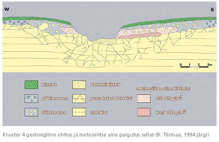 Kaali kraatrid Saaremaa Kaalijärvest algas meteoriidikraatrite avastamislugu Eestis ja Euroopas. Kaalijärve kui ebatavalise loodusnähtuse teadusliku mõtestamise algperioodil (1827 a. alates) esitati selle tekke kohta erinevaid arvamusi: - vulkaaniline plahvatuslehter või vee, auru, gaasi ja muda äkiline purskumine; - lubjakivilõhedest tingitud karstilangatus või soolakupli sissevarisemine; - muistne linnus, kus kaevu ülesandeid täitnud looduslikku järve ümbritses inimeste poolt kuhjatud vall; - ja lõpuks - meteoriidi langemisarm. I. Reinwald tõestas Kaali kraatrite meteoriitse tekke 1937. aastal, leides väikekraatritest 2 ja 5 kolmkümmend meteoriitraua kildu. Kaali meteoriit esindab kõige levinumat raudmeteoriidi tüüpi - jämedastruktuurilist oktaedriiti, milles on Fe 91,5% ja Ni 8,3%, lisandina veel koobaltit, germaaniumi ja iriidiumi. Meteoriidi lihvitud lõikepinnal on nähtav tüüpiline Widmanstätteni struktuur ja ta sisaldab raudmeteoriitidele omaseid mineraale nagu ¨reibersiiti, kamasiiti ja taeniiti. Uuringuandmed Kaali kraatrite tekkeaja kohta on siiani intrigeerivalt vastuolulised. On ainult selge, et kraatrid tekkisid peale mere taganemist Saaremaa antud piirkonnast: neis ei ole meresetteid. Väikekraatrite põhjasetetest leitud maismaatigude subfossiilid viitavad ümbruskonnale kui võsastunud merelähedasele piirkonnale. Kaali järve põhjasetetes leitud taimede õietolm pärined aegadest ligikaudu 3700 aastat tagasi. Radiosüsiniku meetod näitab kraatri põhjasetetest leitud puidutükkide vanuseks vähemalt 4000 aastat. Oletatava silikaatse plahvatusmaterjali leiud ümbritsevate soode turbakihis lubavad oletada, et kraatrid on kuni 7500 - 7600 aastat vanad. Iriidiumiga rikastunud kiht lähedases turbasoos on tekkinud 800-400 a. enne Kristust, mida samuti peetakse Kaali plahvatuste võimalikuks vanuseks. Diskussioonid vanuse kohta jätkuvad tänapäevalgi. Kaali peakraater,mille põhjas asub Kaali järv, on põhiplaanilt peaaegu ümmargune, tema läbimõõt valliharjalt on 105-110 m. Kraatri sügavus valli harjalt kuni dolomiidist põhjani 6-meetrise järvesetete all on 22 m. Vall on 4-7 m kõrgune. Kaali kõrvalkraatrid: kaheksa enamasti kuiva kõrvalkraatri läbimõõt on 12-40 m ja nende sügavus kõigub 1-4 m vahel. Kõik Kaali kraatrivälja kraatrid on liiga suured oletamaks teket plahvatuseta, st puhtalt löögi toimel. Pole leitud ka piisavalt rauda, kui see ei oleks pihustunud plahvatusel. Väikekraatrite põhjast leitud meteoriidikillud võivad pärineda plahvatanud kehadest, aga ka atmosfääris pidurdunud väiksemate kildude langemisest. A. Aaloe oletas, et tegu on löögi-plahvatuskraatritega.