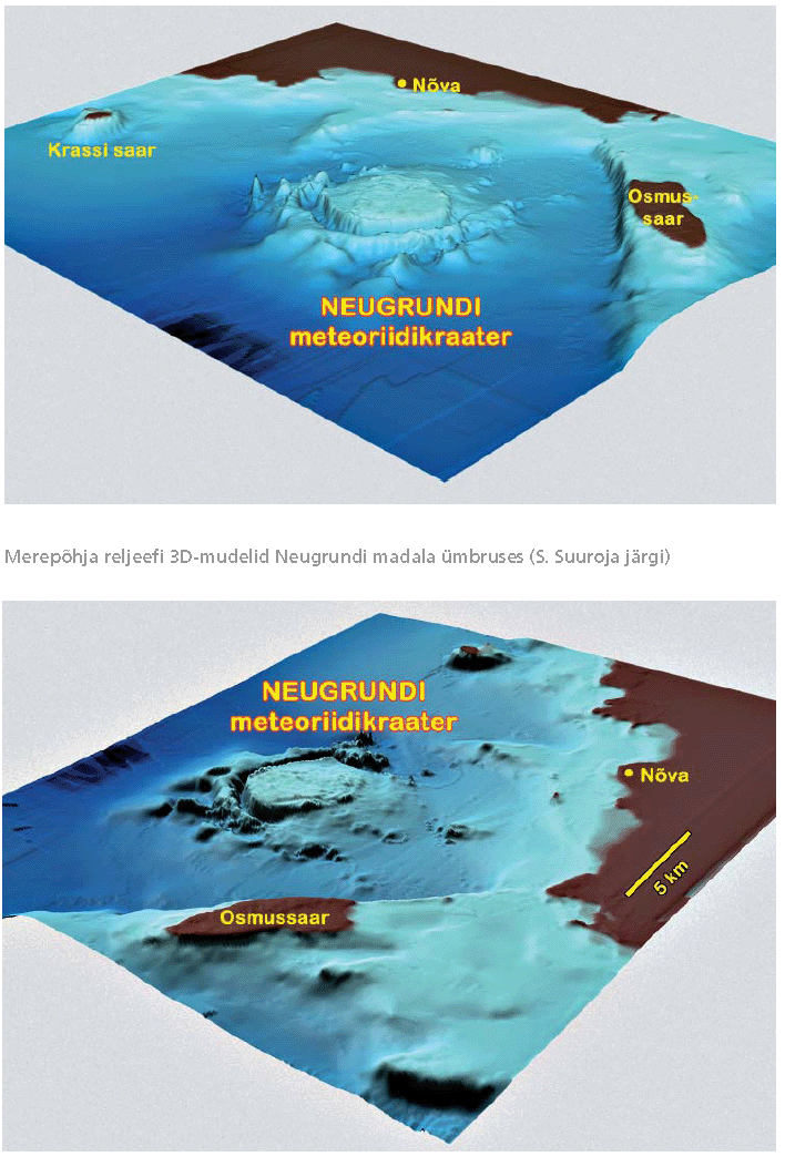 Neugrundi kraater Neugrundi struktuur on Kärdla kraatrist tunduvalt vanem, umbes 535 miljoni aasta vanune. Struktuur on mitmeringine: keskse süviku ümber esineb vähemalt kolm aluskorrakivimitest rõngasvalli. Vallidest seesmine on kõrgeim ja terviklikum ning paremini kättesaadav allveevaatlusteks ja uuringuteks. Struktuuri kesksüviku põhjas on tõenäolisest säilinud bretshakihid ja võimalik et ka plahvatusmagmast tekkinud kivimid. Neid katab plahvatuse järgselt sinna settinud "kork" - jäänuk kraatrit täitvast ja katvast settekivimite lasundist. Eesti suurima ja senistest varjatuima Neugrundi mitmeringilise struktuuri avastamis- ja uurimisloos kajastub geoloogide eriline usk, huvi ja püüdlus kraatrite avastamise suunas. Juba eelmise sajandi algusaegadest olid Osmussaarelt jm geoloogidele teada iseäralikud gneissbret¨ad. Neugrundi kraatri vallirõngaste välisläbimõõt on 9 km, kuid kogu struktuuri läbimõõt on piiritletud koguni 21 km-se läbimõõduga ringmurranguga. Selle madaliku, mille peal on vett vaid 2-20 m, ja teda ümbritseva ringvalli vahele on jääaja erosiooni käigus moodustunud kuni 70 m sügavune ja 200-500 m laiune ringkanjon, mis lõunaosas on täidetud Kvaternaarisetetega. Purustatud kristalse aluskorra kivimitest koosnevad kraatri ringvallid on liustiku poolt tugevalt kulutatud. Kõik see viitab jääaja-aegsete kulutusprotsesside erilisele tähtsusele Neugrundi struktuuri ülakorruste avamisel praegusesse merepõhja ning selle eriliselt liigestatud reljeefi kujundamisele.