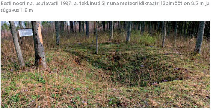 Simuna kraater 1. juunil 1937 a. olid Kirde-Eesti elanikud omapärase loodusnähtuse - ereda boliidi lennu tunnistajaks. Lehtri läbimõõt on valliharjalt 8,5 m, sügavus 1,9 m. Kindlaks tunnuseks, et tegemist on plahvatuse jäljega, oli valli alla mattunud huumusekiht ja osakeste paigutus sellele langenud materjalis. Vallis on plahvatusele tüüpiline materjali järjestus: mattunud mullakihi peal lebavad suuremad kivid ja veerised ning valli ülaosa moodustab peen liiv. Simuna kraater võiks teadaolevalt olla üks vähestest meie inimpõlve jooksul moodustunud meteoriidikraatritest Maal.