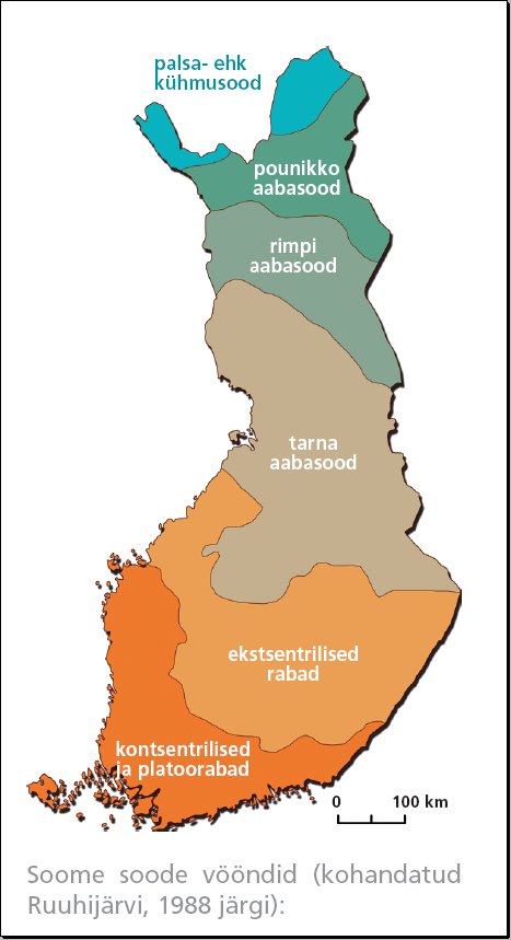 Soode põhitüüpidest Soomes jagatakse sood kuue tüübirühma vahel - korpi (madalsookuusik), räme (puisraba), neva (toitainetevaene madalsoo ja älveraba), letto (toitaineterikas madalsoo), luhta (luha- ehk lammisoo) ja lähdesuo (allikasoo). Ka Eestis võib eristada soode kuut tüübirühma - allikasoo, liigivaene madalsoo, liigirikas madalsoo, luha- ehk lammisoo, siirdesoo ja raba ehk kõrgsoo. Rabade puhul eristatakse Eestis kaht geomorfoloogilist tüüpi - kumerrabad ja platoorabad. Kui kumerrabad levivad valdavalt Eesti idapoolses osas, siis platoorabad on iseloomulikud Lääne-Eestile. Soomes kulgeb kumer- ja platoorabade vöönd piki Soome lahte ja edasi kaarjalt piki Botnia lahe kaguosa kuni Vaasani ning põhja suunas asendub see ekstsentriliste rabade vööndiga. Soome soode vööndid (kohandatud Ruuhijärvi, 1988 järgi)